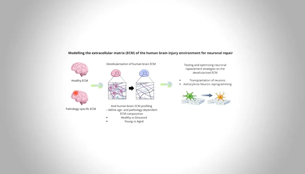 Hirnverletzungen und Neurodegeneration führen zu irreversiblem Neuronenverlust. Dieses Projekt modelliert die Verletzungsumgebung des erwachsenen menschlichen Gehirns durch Dezellularisierung von Hirngewebe adulter Patienten und Charakterisierung der extrazellulären Matrix (ECM). Strategien, abgestorbene Neurone zu ersetzen, einschließlich der Transplantation humaner iPSC-abgeleiteter Neuronen sowie der Reprogrammierung von iPSC-abgeleiteten oder aus Resektionsmaterial isolierten adulten Astrozyten, werden untersucht, um Bedingungen zu definieren, die neuronalen Ersatz über verschiedene Erkrankungen und Altersstufen hinweg ermöglichen.
